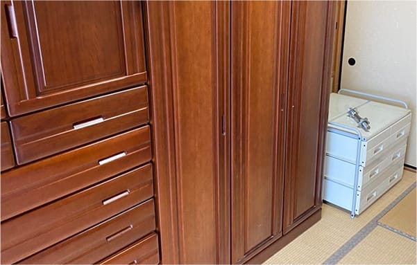 現地に到着すると、お客様が早速タンスのある和室に案内してくださいました。重量感のある家具で、女性にはとても運び出せません。お怪我でもしたら大変です。見積額を伝え、承諾いただいたところで正式依頼となりました。