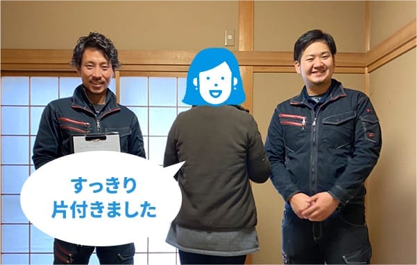 不用品を搬出したあとは掃き掃除を行って、細かいゴミなどを取り除きます。すっきりしたお部屋を見て、清々しいお客様の顔。私たちも嬉しい瞬間です。