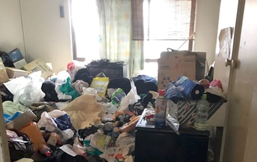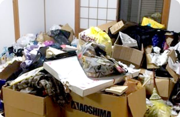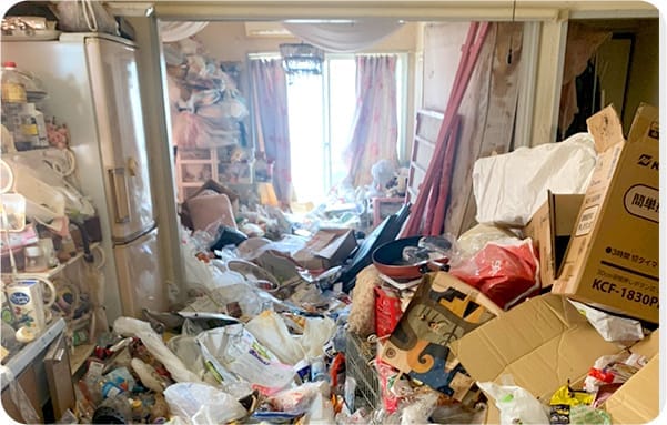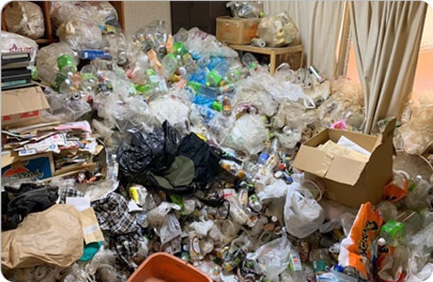 現地マンションに到着すると、お客様がドアの前で待っていました。部屋中がゴミであふれているそうで、とても困ったご様子。お部屋を確認すると、大量のゴミが無造作に置かれ、奥の部屋にはゴミ袋が詰め込まれていました。
