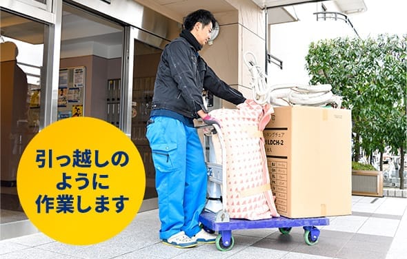 搬出・片付けの後は、掃除機でしっかりとお掃除いたします。ご近所へご迷惑がかからないよう、共有部分の清掃もおこたりません。