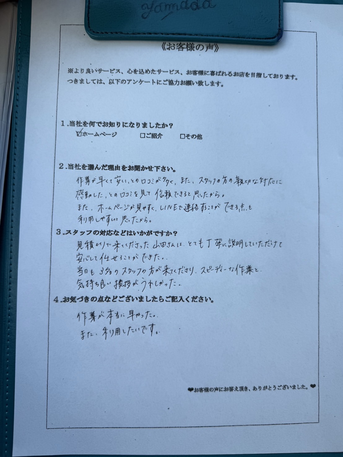 見積もりにお伺いしたスタッフの対応が親切だったことや、説明が丁寧で安心感を持ってくださったことが決め手となり当社をお選びくださったとのことです。