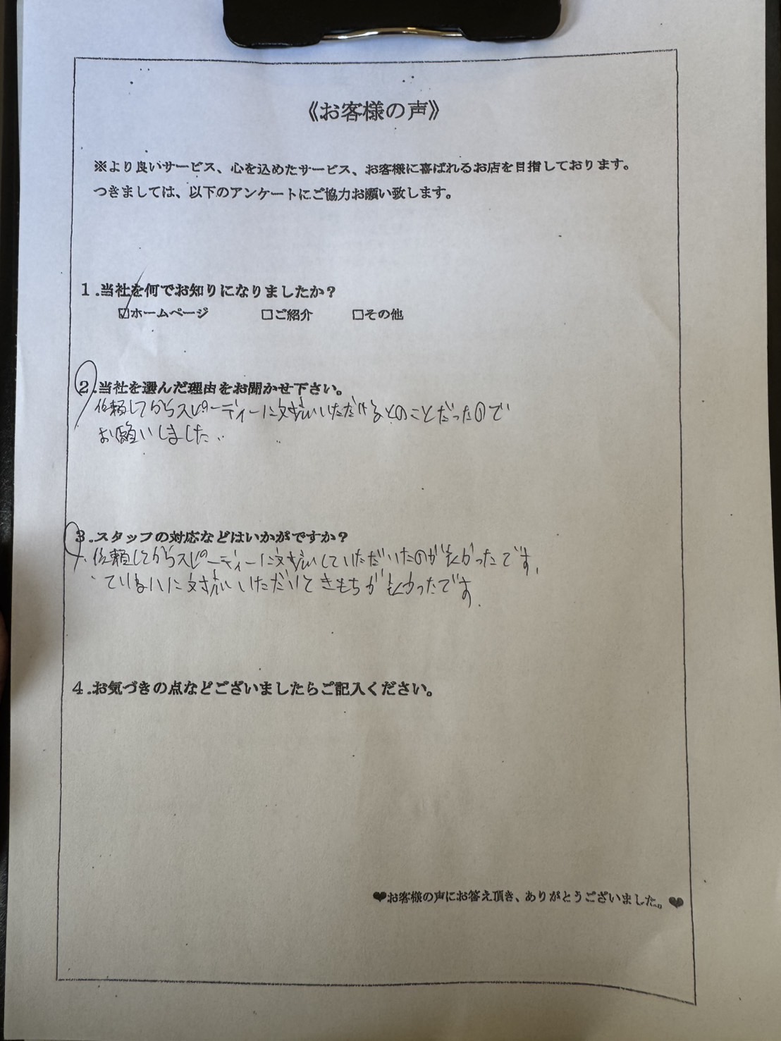 問い合わせからの対応がスピーディーだったことや、問い合わせ時と見積もり時のスタッフの対応が丁寧で気持ちよく任せられそうと感じてくださったことが決め手となり、当社にご依頼をいただくことができました。