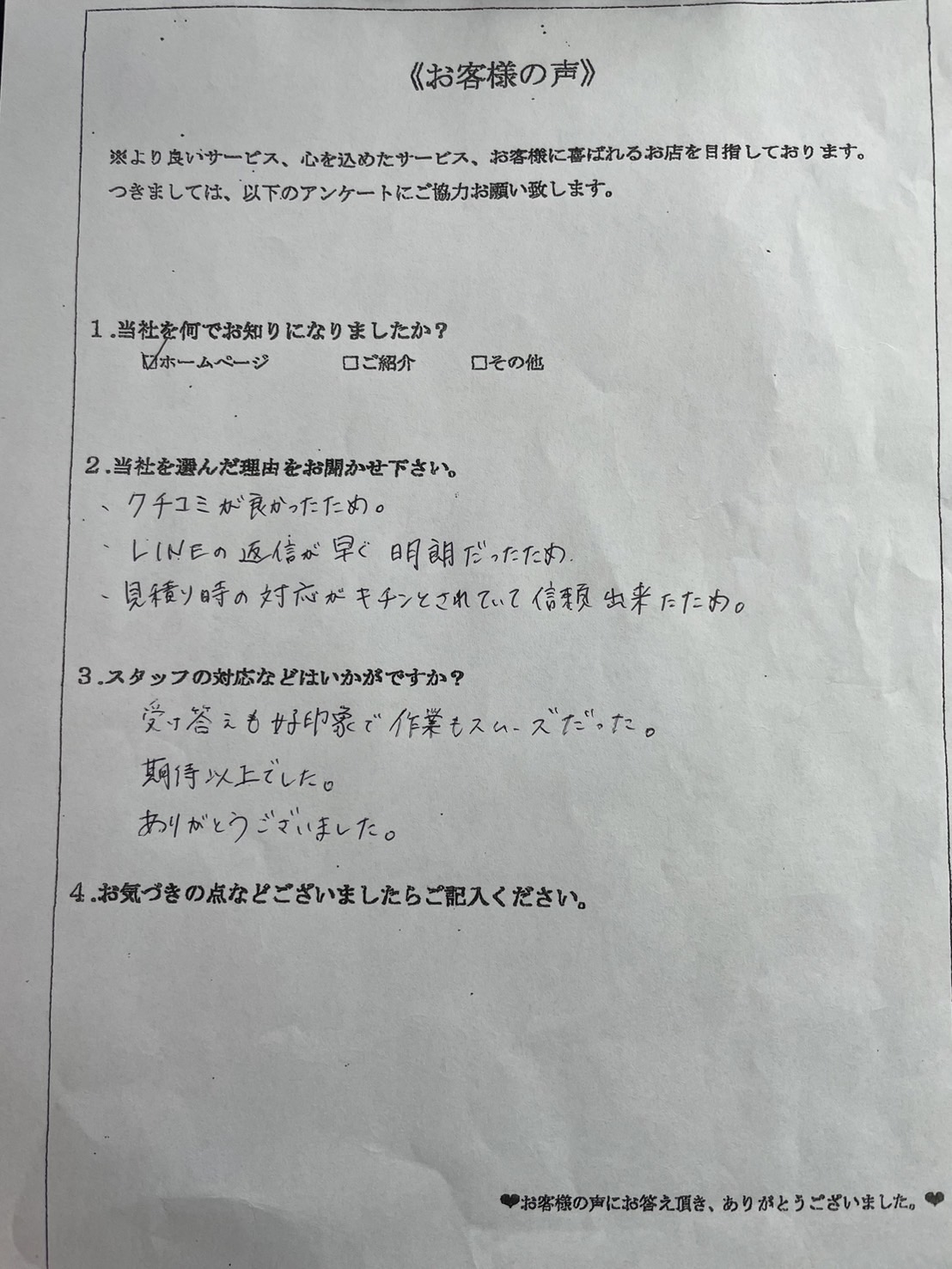 問い合わせをしてからの返事がスピーディだったことや、見積もりにお伺いしたスタッフの対応が真摯で信頼できそうと感じてくださったことから、当社をお選びくださったとのことです。