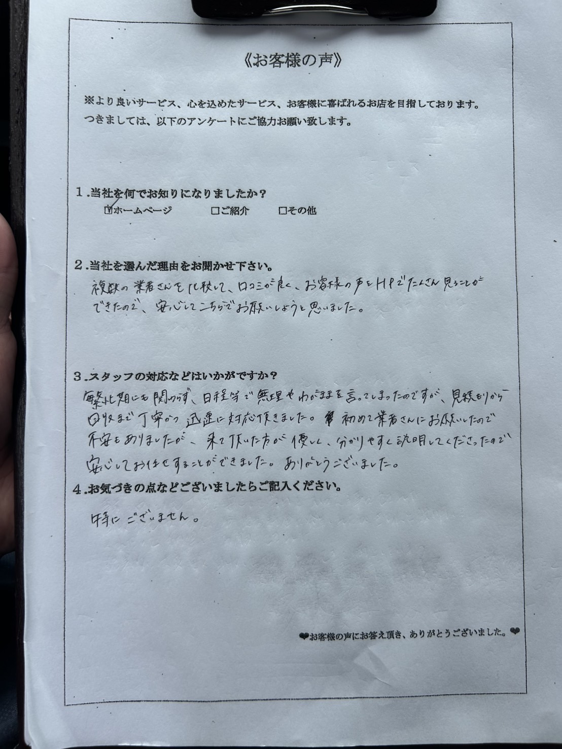 問い合わせから見積もりまでの対応がスピーディーだったことや、回収の日程についてもお客様のご希望に添えたこと、見積もり時のスタッフの説明が分かりやす買ったことが決め手となり、当社をお選びくださったとのことです。