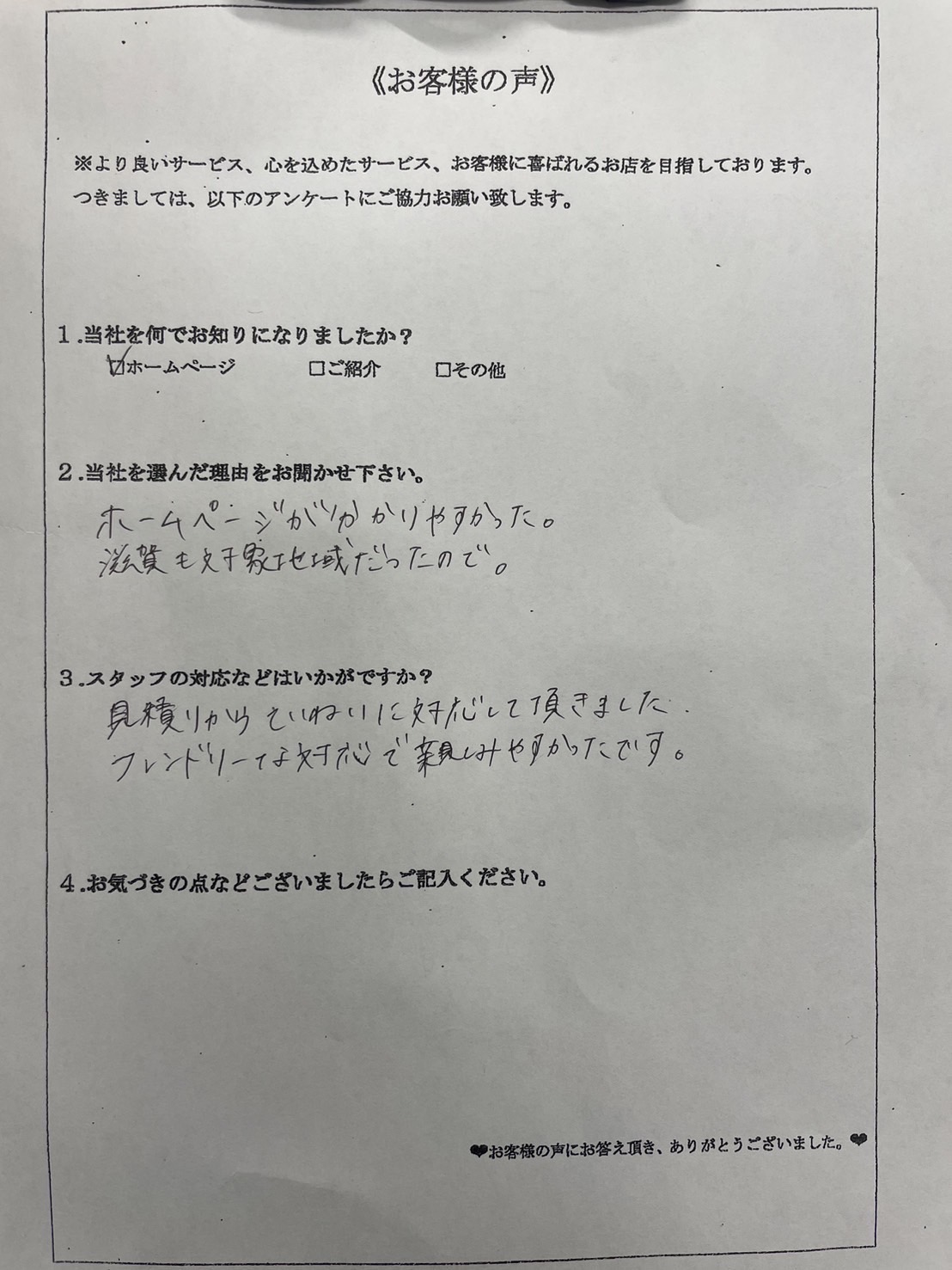 見積もり時のスタッフの対応が丁寧だったことや、親しみがあり相談しやすかったことが決め手となり、当社にご依頼をくださいました。